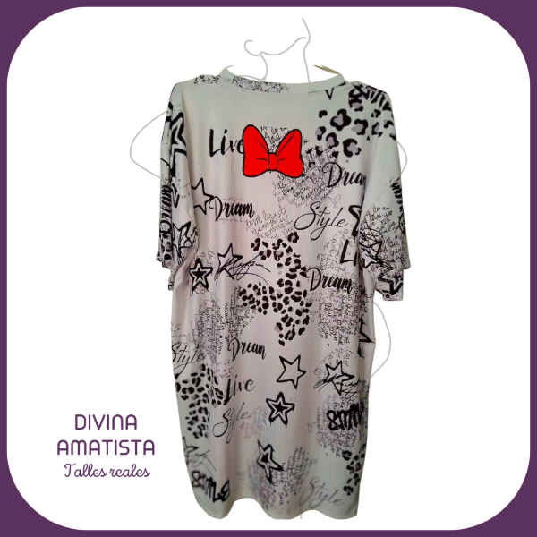 Talle único equivale a un Talle 7/8 de pijamas. Largo 75 cm. Circunferencia busto 106 cm , circunferencia de cadera 130 cm.