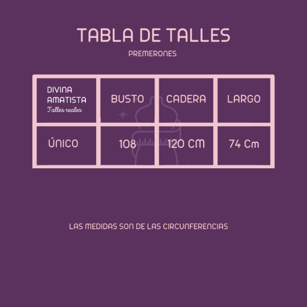 Talle único equivale a un Talle 5/6 de pijamas. Largo 74 cm. Circunferencia busto 106 cm , circunferencia de cadera 120 cm.